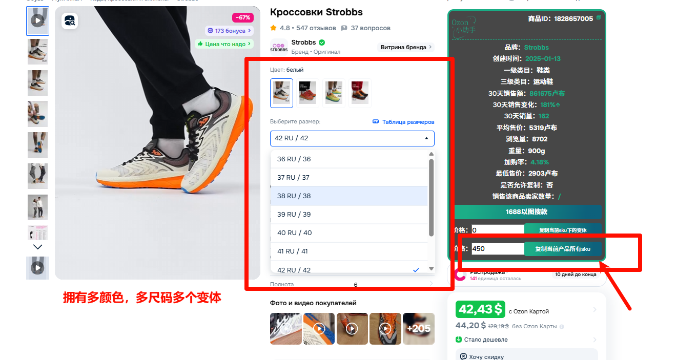 某些商品往往存在多个变体,比如颜色、尺码等。为了方便上品,可以使用插件的复制变体功能。如图,在ozon前台点开商品详情页,插件显示页。填入价格,点击复制即可复制以“id,价格”的文本形式。该功能可以和小助手模式二配合使用。相当于软件中的复制变体。会更节省时间