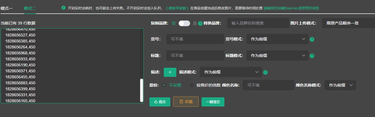 复制成功后粘贴到小助手上架产品页面的模式二框框里,效果如下图,点击提交即可一次性上架多变体的数据