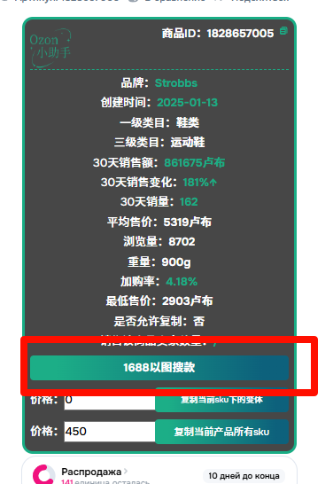 在ozon前台商品,插件显示页,点击1688以图搜款按钮即可跳转到1688搜索同款商品页面